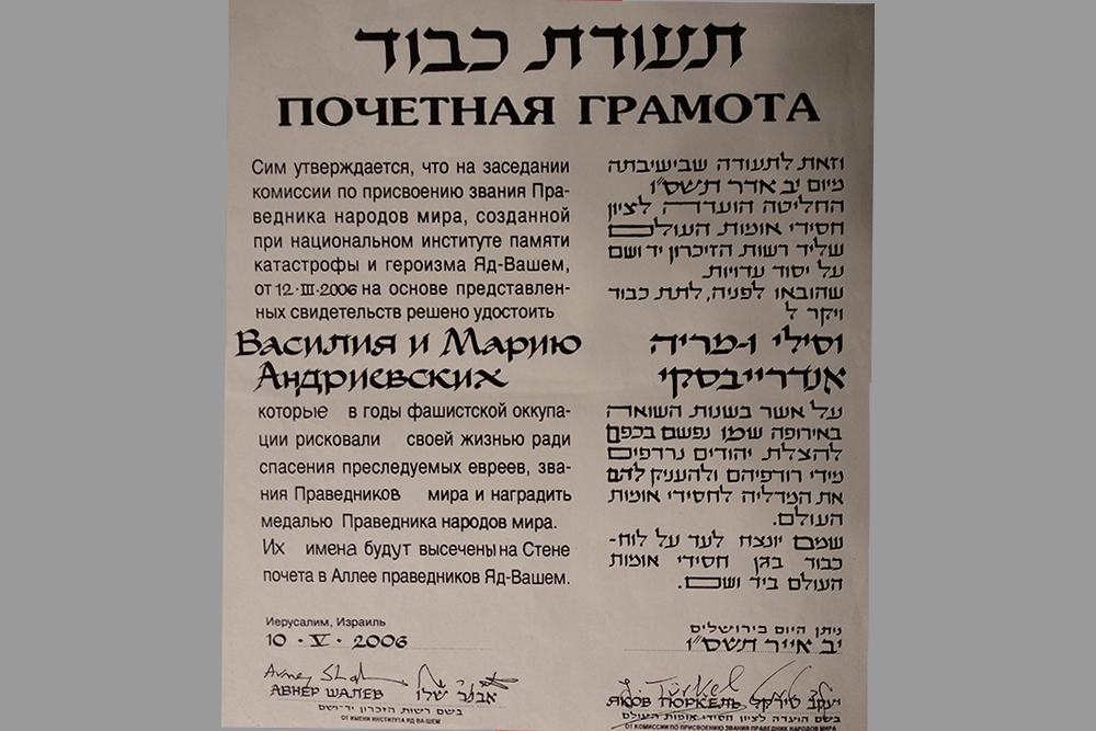 Сім’я Чмеликів досі дуже вдячна за героїчний і щиросердний учинок Василю та Марії Андрієвським. Ці люди абсолютно свідомо стали пліч-о-пліч із гнаними й розділили їхню долю. Перемогли непереможне на той момент зло і прийняли місію Праведника. У 2006 р. Василя й Марію Андрієвських уряд Ізраїлю посмертно удостоїв звання «Праведник народів світу». Їхніх дітей було відзначено як Праведників України. Імена героїв викарбувано на Стіні Праведників у Музеї Яд Вашем у м. Єрусалим.