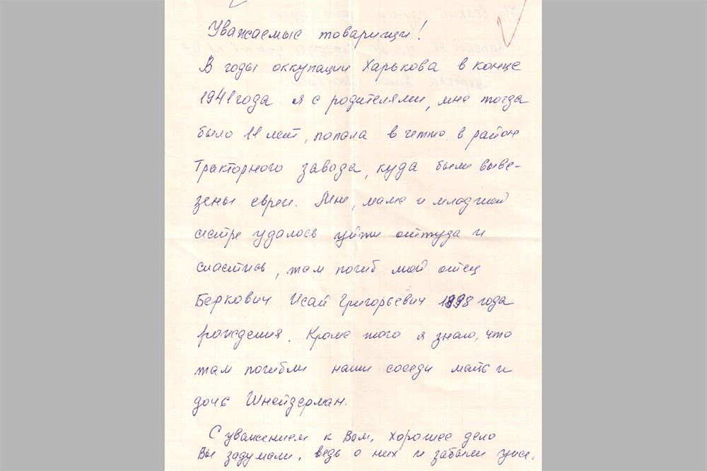 Олександрі Бєловій вдалося в обмін на продукти дістати на базарі паспорт на ім’я росіянки Ксенії Борисівни Лопатинської та вклеїти в нього фотографію Рози Беркович. Це дало змогу Розі з дочкою піти з м. Харків і вижити.