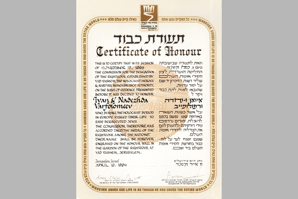 17 листопада 1993 р. Яд Вашем удостоїв Івана й Надію Варфоломіїв почесного звання «Праведник народів світу».