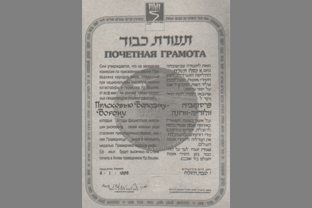 30 листопада 1997 р. Яд Вашем ушанував Параскеву Володіну-Ворону званням «Праведник народів світу».