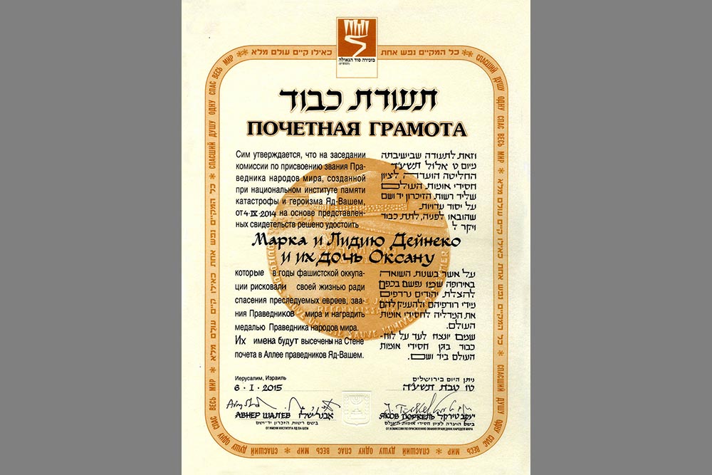 Звання «Праведник народів світу» присвоєне Дейнекам Яд Вашемом 4 вересня 2014 р. У почесній грамоті зазначено імена трьох членів родини: Марка, Лідії та їхньої доньки Оксани. Нагородження відбулося 16 червня 2016 р. в Національному музеї історії України у Другій світовій війні. Меморіальний комплекс (Київ). Медаль та почесну грамоту з рук Надзвичайного і Повноважного Посла Держави Ізраїль в Україні пана Еліава Бєлоцерковські отримала 88-річна Оксана Антипчук (Дейнеко). Імена членів родини викарбувані на Стіні Пам’яті Алеї Праведників народів світу в Яд Вашемі.