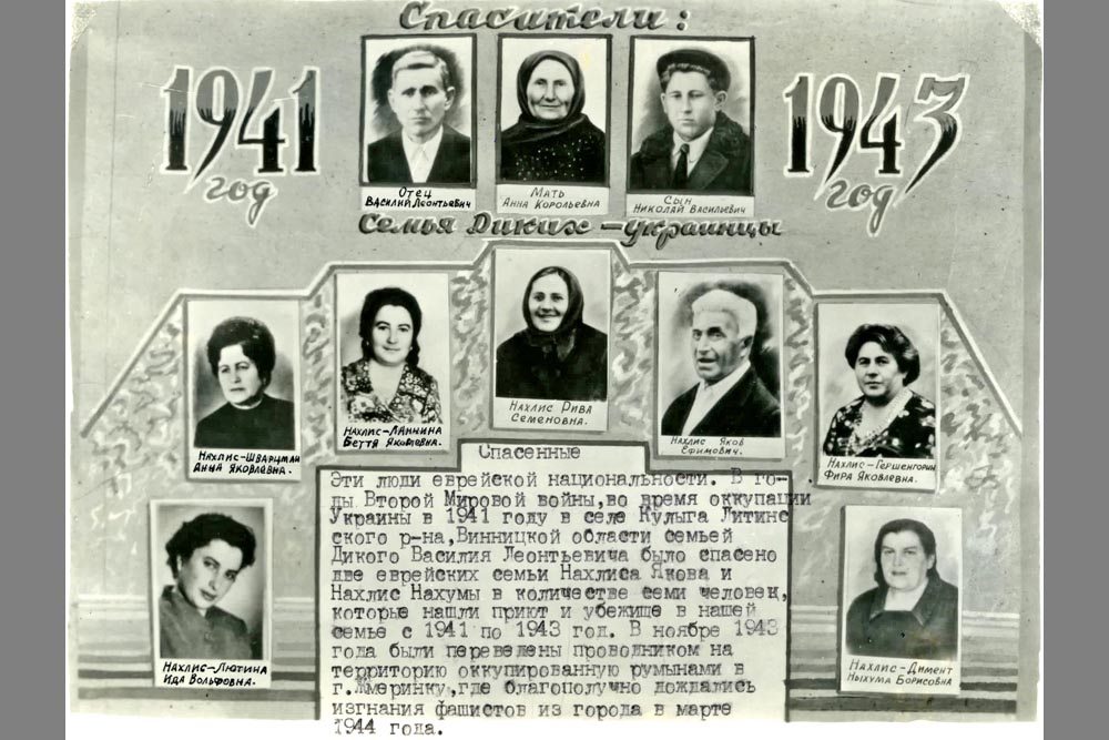 Василь та Ганна Дикі із сином Миколою проживали в с. Кулига на Вінниччині. Українська родина товаришувала з братами Яковом та Вольфом Нахлісами, домівка яких була неподалік. У липні 1941 р. німці окупували населений пункт і відразу почали переслідувати місцевих євреїв. 18 серпня Вольфа розстріляли, а в жовтні народилася його донька Іда. Щоб урятувати дівчинку, Василь Дикий переконав Вольфову дружину Нехаму підкинути новонароджену донечку бездітному подружжю. Як він і очікував, ті люди відразу забрали немовля з ґанку до хати, навіть не запідозривши, що воно єврейське. Нехама змушена була переселитися до гетто в с-ще Літин. Туди було переміщено євреїв із навколишніх сіл, їх заганяли за колючий дріт і розподіляли по бараках. У кожному проживало п’ять-шість родин. 19 грудня 1941 р. в селищі було розстріляно майже 2 тис. осіб. Загалом за період від червня 1941 р. до березня 1944 р. там знищили понад 3200 євреїв. У червні 1942 р. Василь Дикий, підкупивши охоронця, вивіз Нехаму Нахліс із гетто. Відтоді вона переховувалась у його будинку. Ганна, Василева дружина, почала забирати маленьку Іду в сусідів, нібито погратися, тож Нехама мала нагоду побути з донечкою.