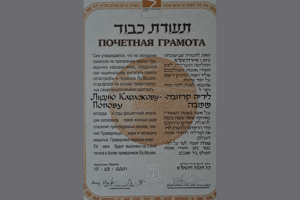 29 квітня 2001 р. Яд Вашем удостоїв Лідію Каражову (Попову) звання «Праведник народів світу».