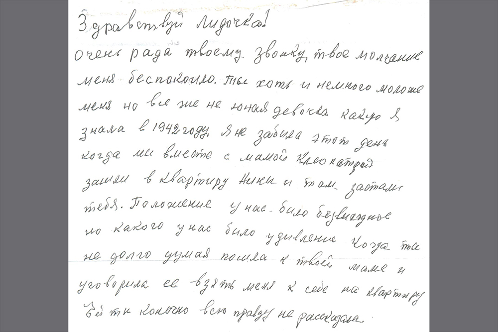 «…Я вдячна жінкам, які врятували мене від загибелі. Із Клеопатрою Федорівною я не розлучалась до її смерті. Вже немає Лідії Ігнатової… За порятунок гнаної єврейки прошу визнати Лідію Іллівну Каражову (Попову) Праведником народів світу. Вона врятувала мене, ризикуючи власним життям…». Зі спогадів Єлизавети Пелех (Вайдман)