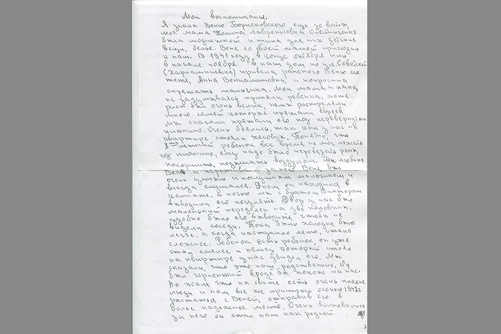 «Поки стояли холоди, було легше, а коли настало літо, малий посміливішав і німець, який проживав у будинку, побачив його. Ми сказали, що це наш родич. Він був чорнявий і трохи схожий на нас. Восени 1942 року нам все ж довелося розлучитися з Венею, відправивши його в більш безпечне місце. Ми дуже хвилювались за хлопчину, який став нам як рідний.» Зі спогадів Валентини Пономарьової (Олейниченко)