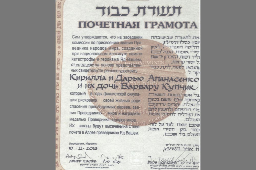У 2012 р. Яд Вашем визнав Кирила й Дарію Опанасенків та їхню дочку Варвару Купчик Праведниками народів світу.