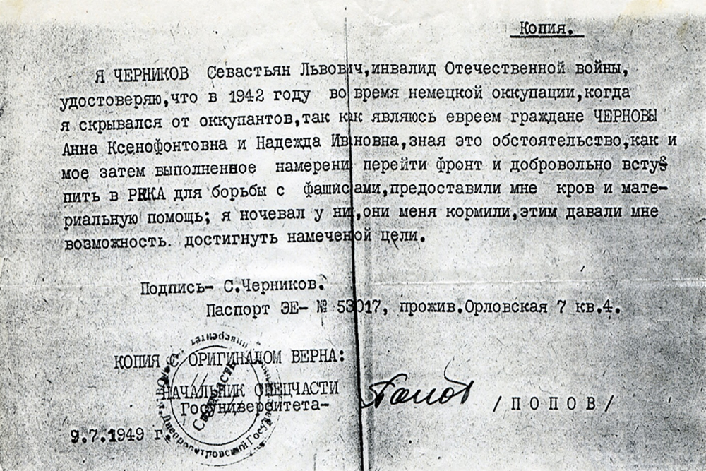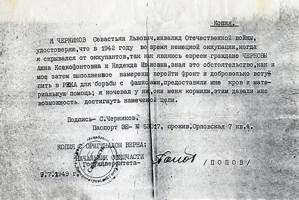 Севастян Черніков повернувся з фронту інвалідом. Він не забув своїх рятівниць, знайшов Надію і до самої смерті (1952 р.) підтримував із нею дружні стосунки. За власною ініціативою він склав письмове свідчення (документ датований 1949 р.) про факт свого порятунку. У 1999 р. на основі цього свідчення ізраїльським інститутом Яд Вашем Анні Ксенофонтовні Черновій і Надії Іванівні Черновій було присвоэне високе звання «Праведник народів світу».